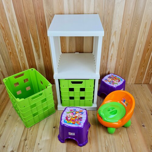Детская пластиковая тумба-этажерка "Весёлые ребята" с горшком "Тёма". Цвет: Бежево-салатовый.