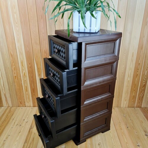Комод пластиковый, "УЮТ", усиленный, 5 этажей, Цвет: Коричневый с шоколадными плетёными ящиками. Арт: К-003-Д5Ш