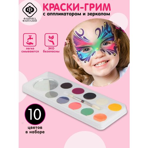 Грим театральный для лица и тела, палитра 10 цветов, Фабрика Фантазий / Аквагрим для детей, набор краски для грима с кистью-аппликатором и зеркалом / Halloween, хэлоуин