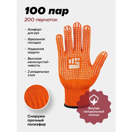 Перчатки защитные Фабрика Перчаток перчатки хб 2-слойные с ПВХ 10 класс, 6 нитей, оранжевые, L, 100 пар