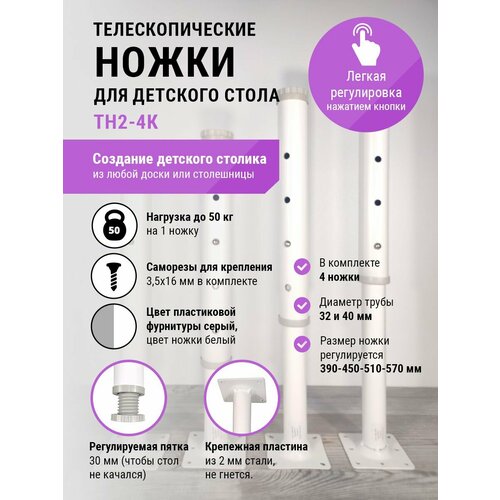 Ножки для детского стола телескопические высотой от 39 до 57 см (фиксация кнопкой). Материал сталь, матовый. Комплект 4 шт.