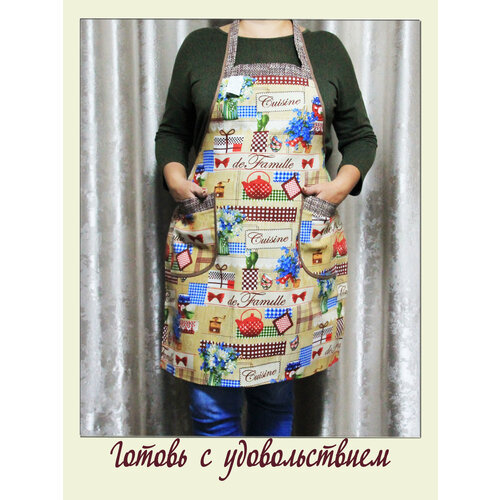Фартук кухонный женский "Чайники с синим" бежевый большие размеры хлопок