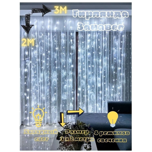 Гирлянда светодиодная штора 3x2 м/ провод прозрачный/ LED-320/ 220V/ 8 режимов/ белая