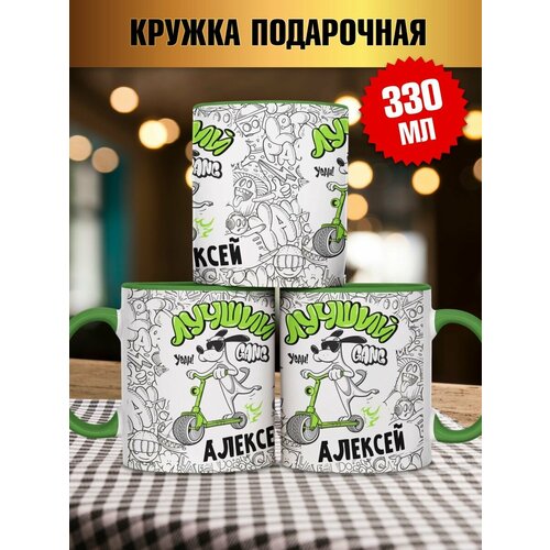 Кружка для чая детская зеленый цвет с надписью Лучший Алексей