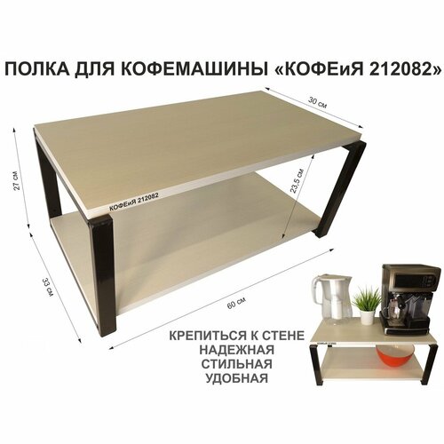 Полка под кофемашину к стене, высота 25см, черный каркас "кофеия 212082" размер 25х30х60см, сосна