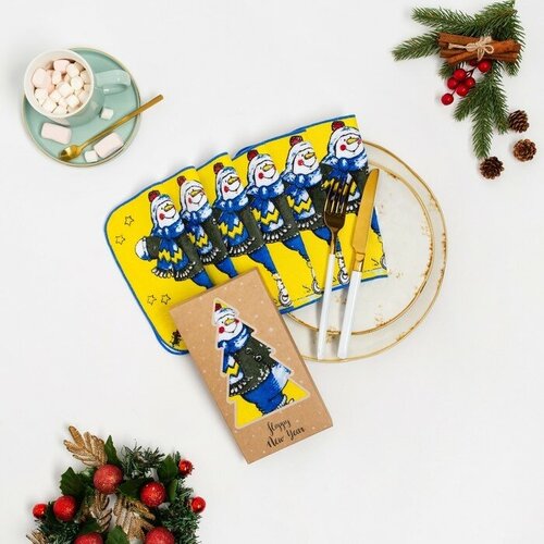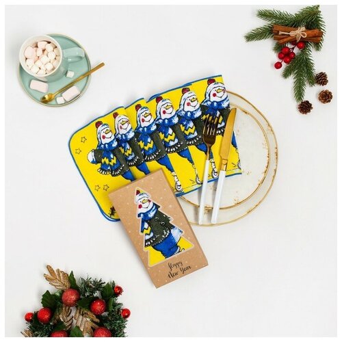 Набор новогодних салфеток Снеговик на желтом, размер 20x20см, 6 шт, велюр 380г/м2, 100% хлопок