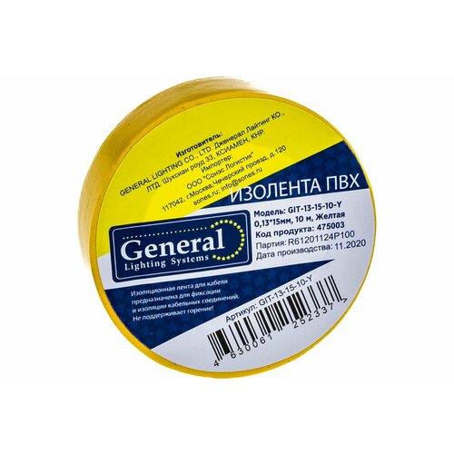 Изолента General Lighting Systems ПВХ GIT-13-15-10-Y 0,13х15мм, 10м, желтая 1/10/400 475003