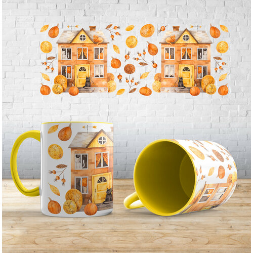 Кружка с принтом "Кошкин дом", Желтый, керамика, в подарок на хэллоуин