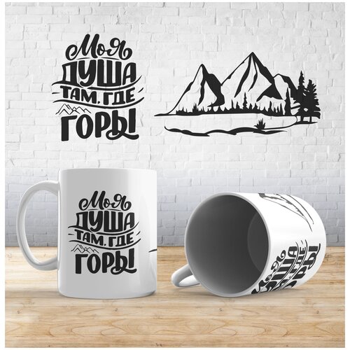 Кружка с принтом рисунком надписью "Моя душа там, где горы", Белый, 1 шт.