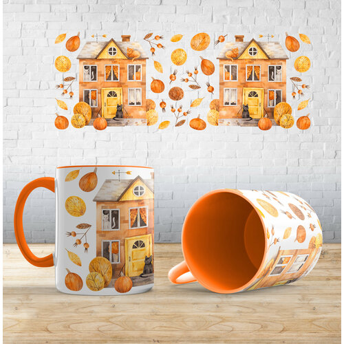 Кружка с принтом "Кошкин дом", Оранжевый, керамика, в подарок на хэллоуин