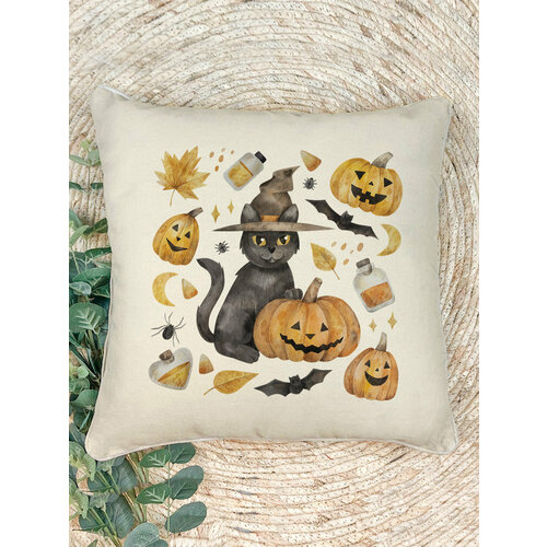 Наволочка для декоративной подушки "Кот в шляпе с тыквой", 41х41 см, в подарок на хэллоуин