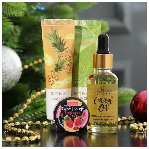 Подарочный новогодний набор в сфере / шаре: крем для рук "Грейпфрут", крем для рук "Яблоко", скраб для губ "Роза", масло для увлажнения и питания кутикулы с ванилью.