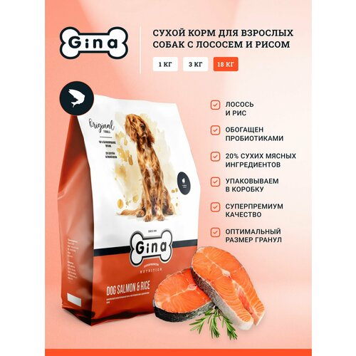 Сухой корм для собак Gina с лососем, супер премиум, для умеренно активных, 18кг, Dog Salmon & Rice