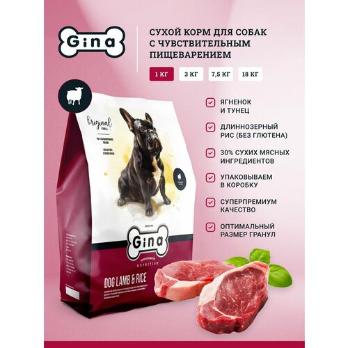Сухой корм для собак Gina с ягненком и тунцом, супер премиум, для умеренно активных, 1кг, Dog Lamb & Rice