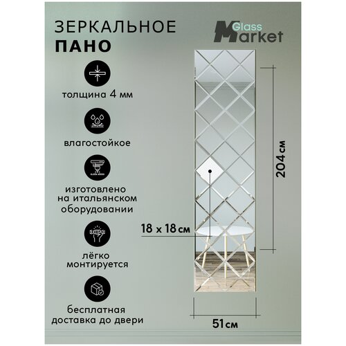 Зеркальное панно GlassMarket Зеркальное панно на стену из зеркальной плитки 18 см с фацетом 10 мм (размер 51х204см)
