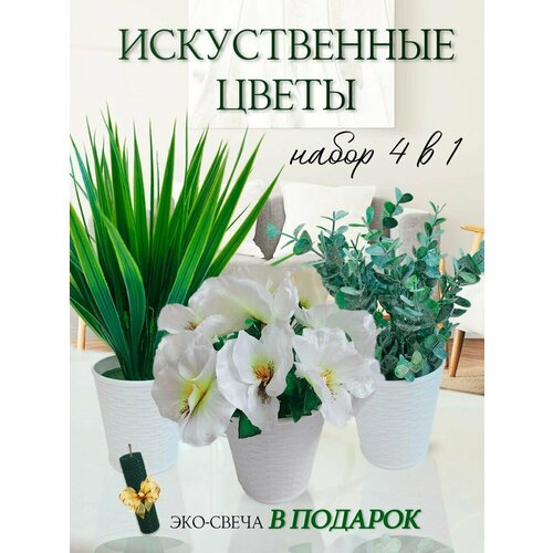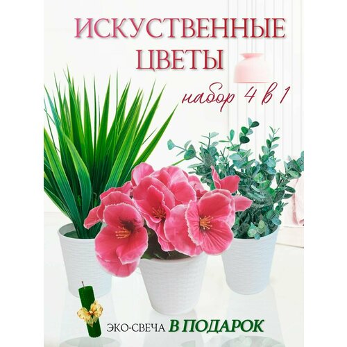 Набор 4 в 1: Лаванда, Лаванда и Эвкалипт в кашпо + свеча в подарок. Искусственные цветы для декора и интерьера