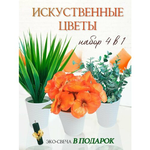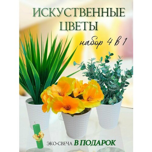 Набор 4 в 1: Ландыш, Эвкалипт, трава Осока в кашпо и свеча в подарок