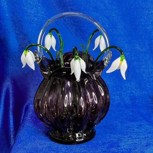 Подснежники стеклянные цветы 5 шт. + корзинка марганцевая с прозрачной ручкой из цветного стекла 22 см