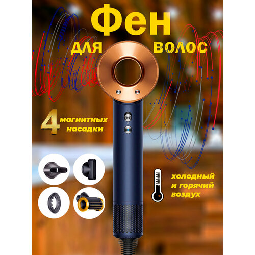 Супер фен Super Hair Dryer с 5 насадками / Фен для волос Супер хайер драйер/3 скорости/ 3 температурных режима / 5 магнитных насадок/Золотой