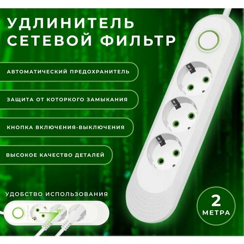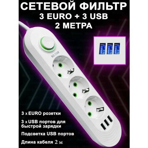 Cетевой удлинитель, 3 розетки, 3 usb, шнур 2 метра. ( сетевой фильтр с юсб, электрический разветвитель, переноска)