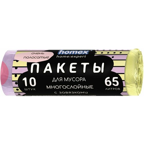 Пакеты для мусора Homex home: expert Очень Полосатые с завязками сиренево-желтые 65л*10шт 1 уп
