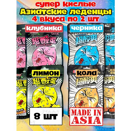 Китайские леденцы кислые конфеты Sour Candy ассорти вкусов Черника, Клубника, Лимон, Кола/ Набор азиатских сладостей 8 упаковок карамелек