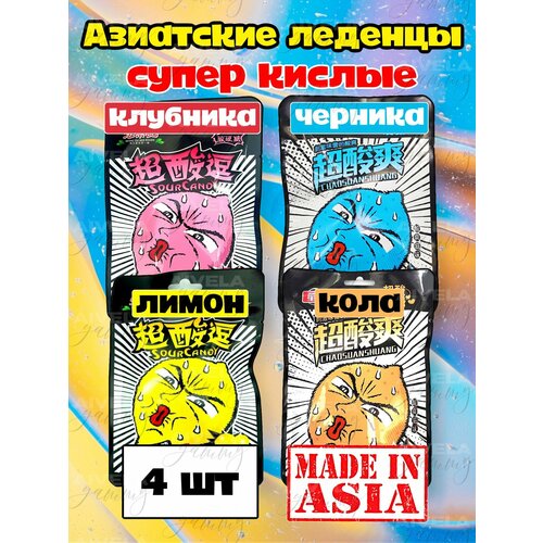 Китайские леденцы кислые конфеты Sour Candy ассорти вкусов Черника, Клубника, Лимон, Кола/ Набор азиатских сладостей 4 упаковки карамелек