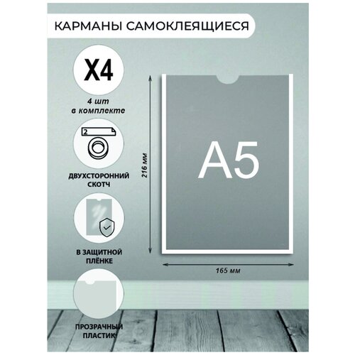 Карман настенный А5 (216х165 мм) вертикальный, прозрачный, со скотчем, 4 шт
