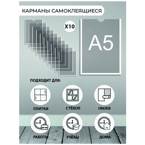 Карман настенный А5 (216х165 мм) вертикальный, прозрачный, со скотчем, 10 шт