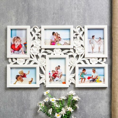 Фоторамка пластик на 6 фото 10х15 см "Куст роз" белая 35,5х56,5х2 см