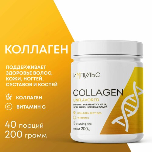 Коллаген порошок с витамином C Импульс, Добавка для кожи, волос и ногтей, Добавка для связок, суставов и костей, 40 порций, 200 грамм