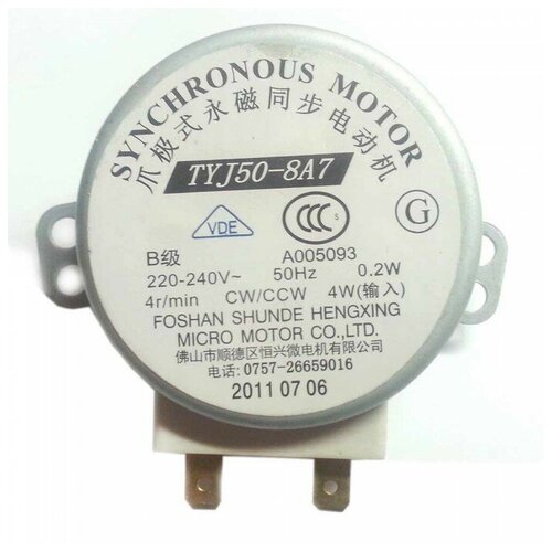 Двигатель вращения поддона СВЧ, TYJ50-8A7, 4W, 4 об/мин, шток 14 мм, 220V (p/n: Д010)