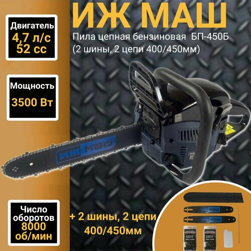 Пила цепная бензиновая ИжМаш БП-450Б (2 шина, цепь 400/450мм), 52CC, 4.7 л. с. 3500Вт, 8000об/мин