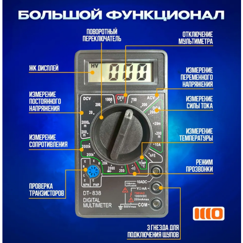 Мультиметр цифровой DT838 токоизмерительный, тестер электрический измерительный инструмент с функцией прозвонки