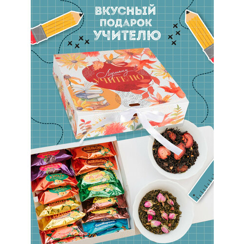 Подарочный набор конфеты Фрукты в шоколаде ассорти и чай "Лучшему учителю"
