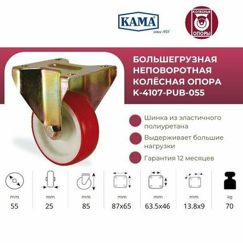 Неповоротная колесная опора KAMA, K-4107-PUB-055. Диаметр 55 мм. Грузоподъемность 70 кг.