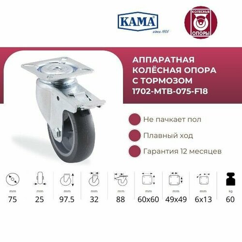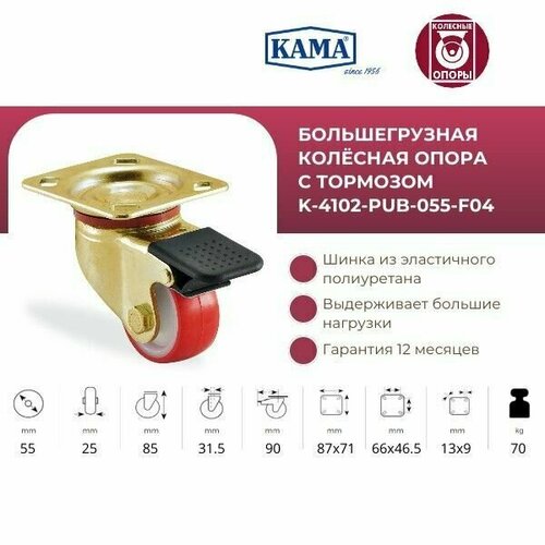 Поворотная колесная опора KAMA с тормозом, K-4102-PUB-055-F04. Диаметр 55 мм. Грузоподъемность 70 кг.