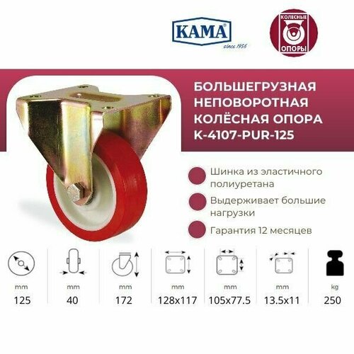 Неповоротная колесная опора KAMA, K-4107-PUR-125. Диаметр 125 мм. Грузоподъемность 250 кг.