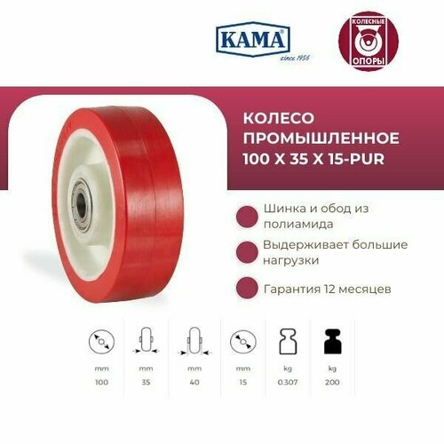 Колесо КАМА, 100x35x15-PUR. Диаметр 100 мм. Грузоподъемность 200 кг.