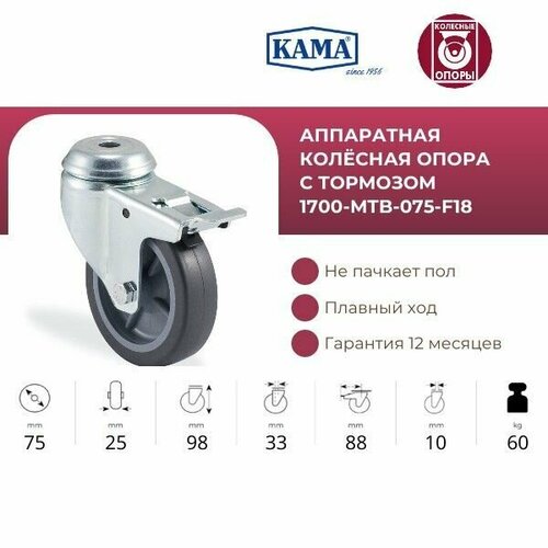 Поворотная колесная опора с тормозом 1702-MTB-075-F18. Диаметр 75 мм. Грузоподъемность 60 кг.