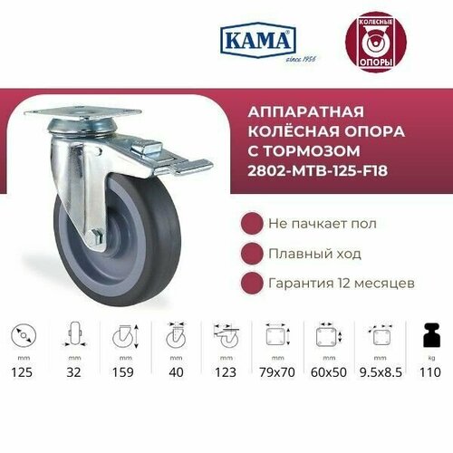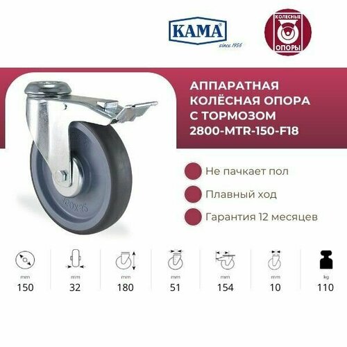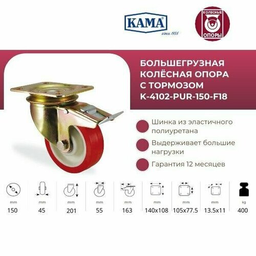 Поворотная колесная опора KAMA с тормозом, K-4102-PUR-150-F18. Диаметр 150 мм. Грузоподъемность 400 кг.