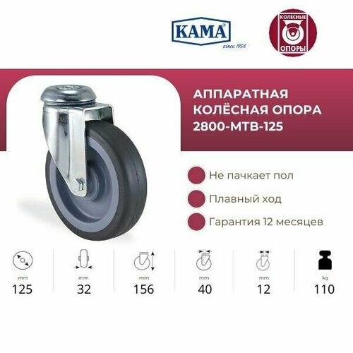 Колесная опора усиленная 2800-MTB-125, поворотная под болт, диаметр 125 мм, грузоподъёмность 110 кг.