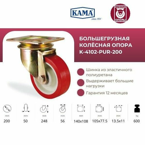 Поворотная колесная опора КАМА, K-4102-PUR-200. Диаметр 200 мм. Грузоподъемность 600 кг.