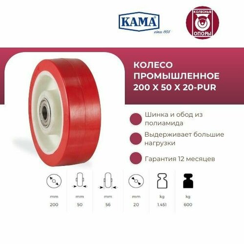Колесо КАМА, 200x50x20-PUR. Диаметр 200 мм. Грузоподъемность 600 кг.