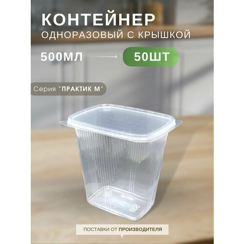 Контейнеры одноразовые пластиковые пищевые с крышкой прозрачные 500 мл, набор контейнеров 50 шт, "Каштан Практик М"