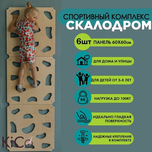 Спортивный комплекс для дома, Детский спорткомплекс, скалодром детский с отверстиями пристенный, панель 60х60, 6шт