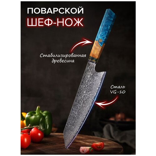 Нож шеф - повара профессиональный из стали VG-10 / Кухонный шеф - нож универсальный Лезвие 21,5 см