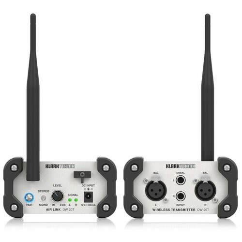 KLARK TEKNIK DW 20T передатчик стерео 2,4 ГГц, регулировка уровня, входы Jack и XLR, радиус 30 метров, крепление на стену