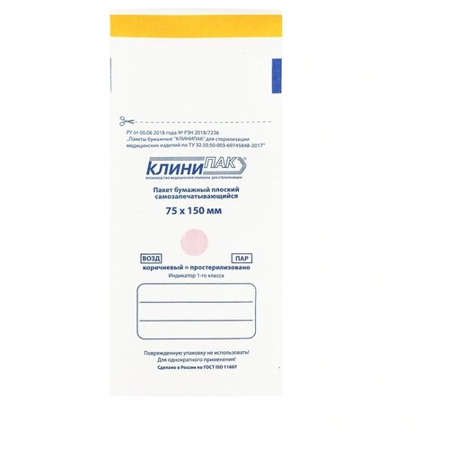 Пакет д/стерил. бум. 75 х 150 мм самокл. 100 шт/уп Клинипак