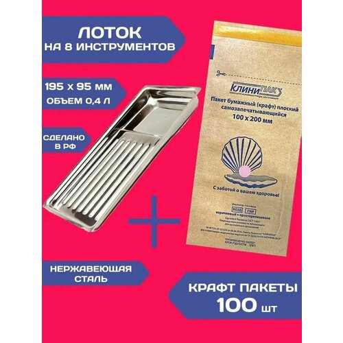 Набор крафт-пакетов Клинипак 10х20 см 100шт + лоток медицинский 400мл